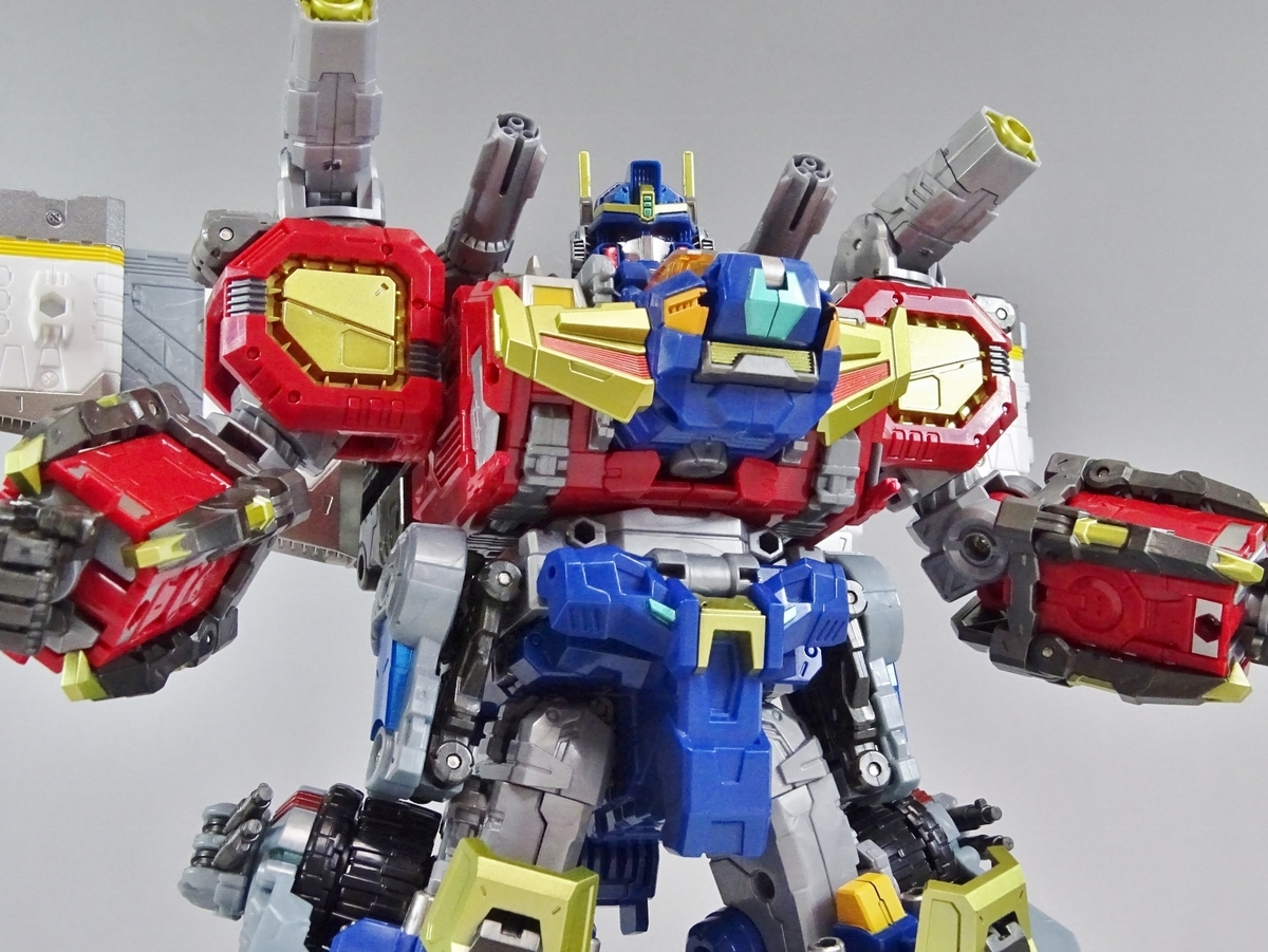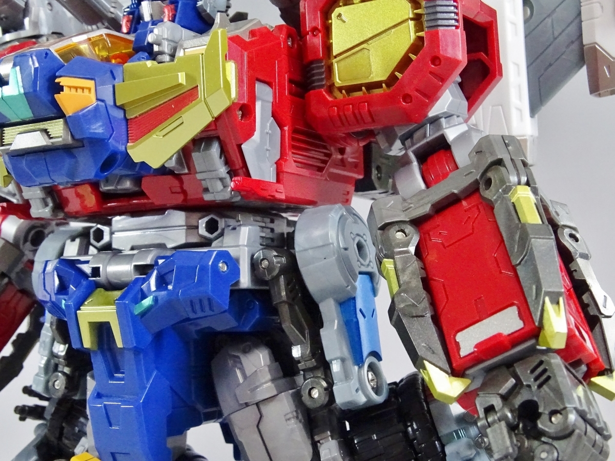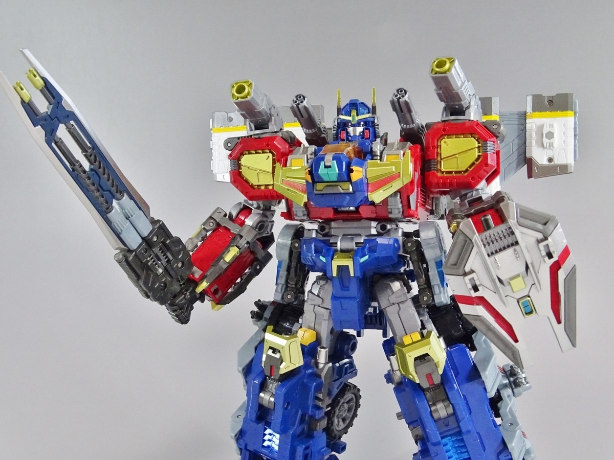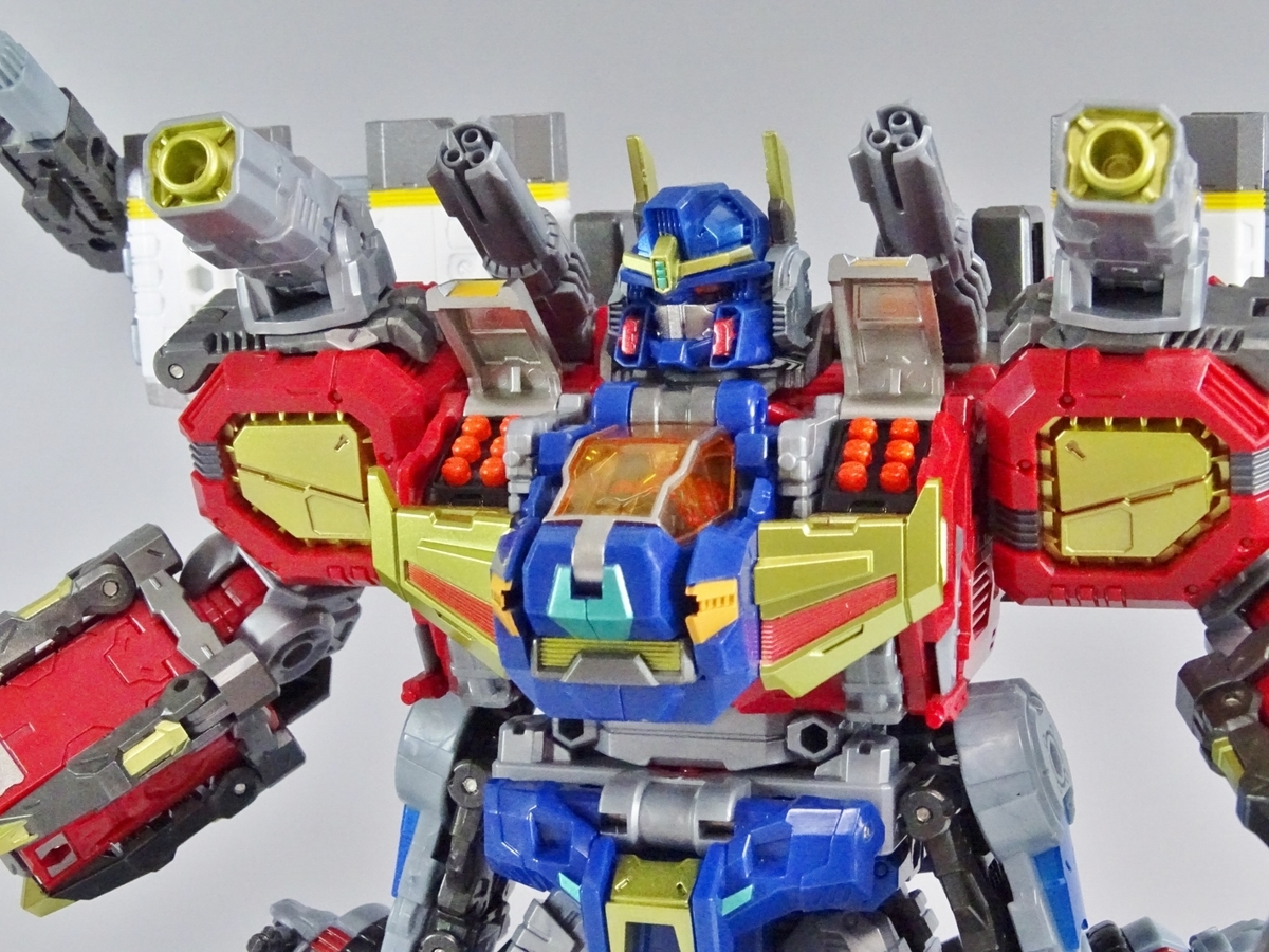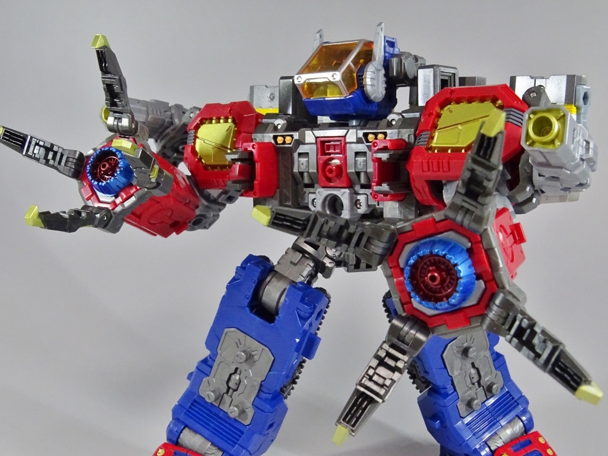バトルコンボイとパワードグレイターの合体形態である新生パワードコンボイ。旧パワードコンボイはトランスフォーマーのウルトラマグナスの流用元として有名ですが、バトルコンボイが旧型の面影を色濃く残していたのに対し、パワードコンボイは全く異なる雰囲気のロボへと変貌しました。グレイターの名の通り、さながらグレート合体した勇者ロボのようです