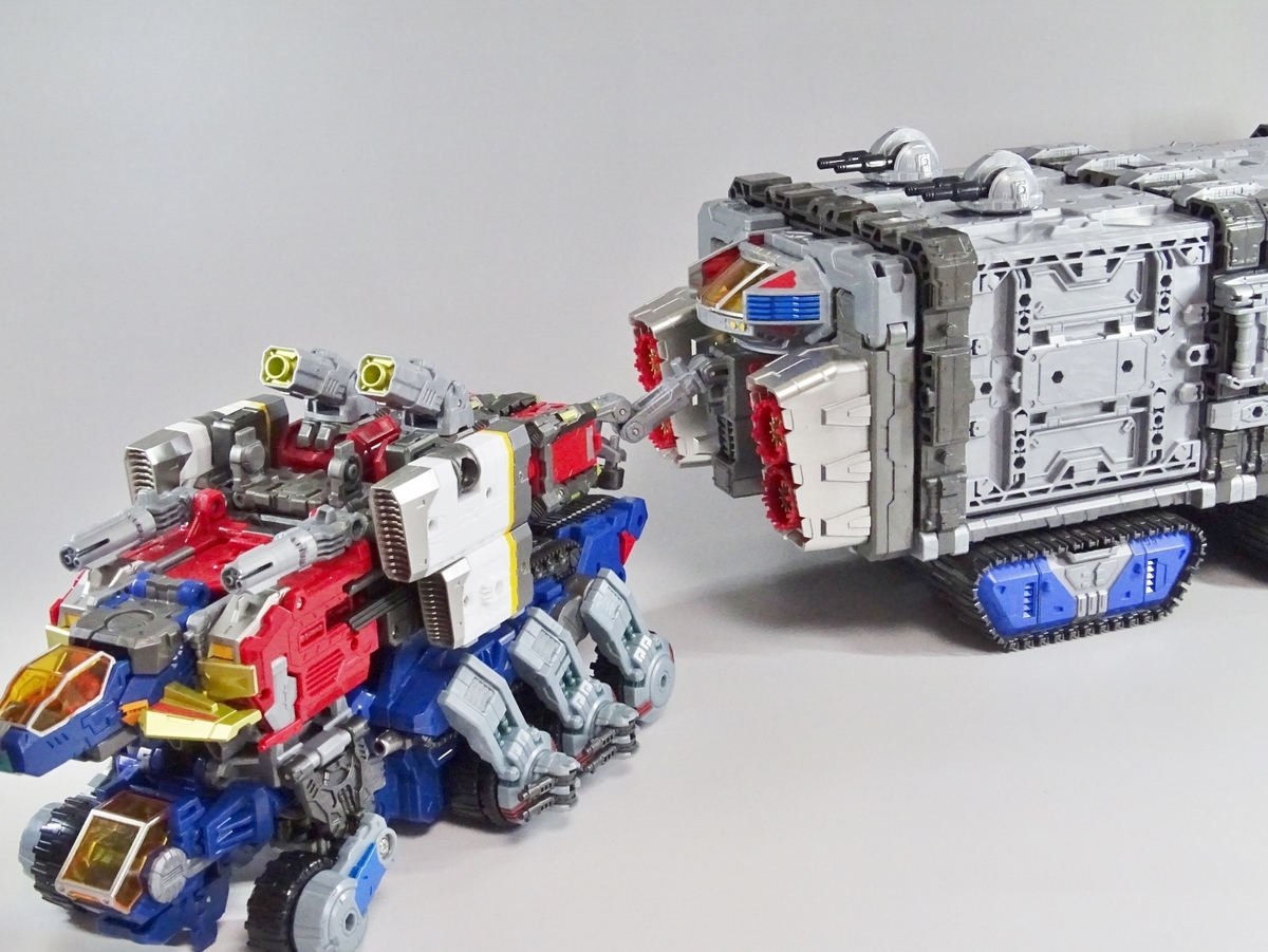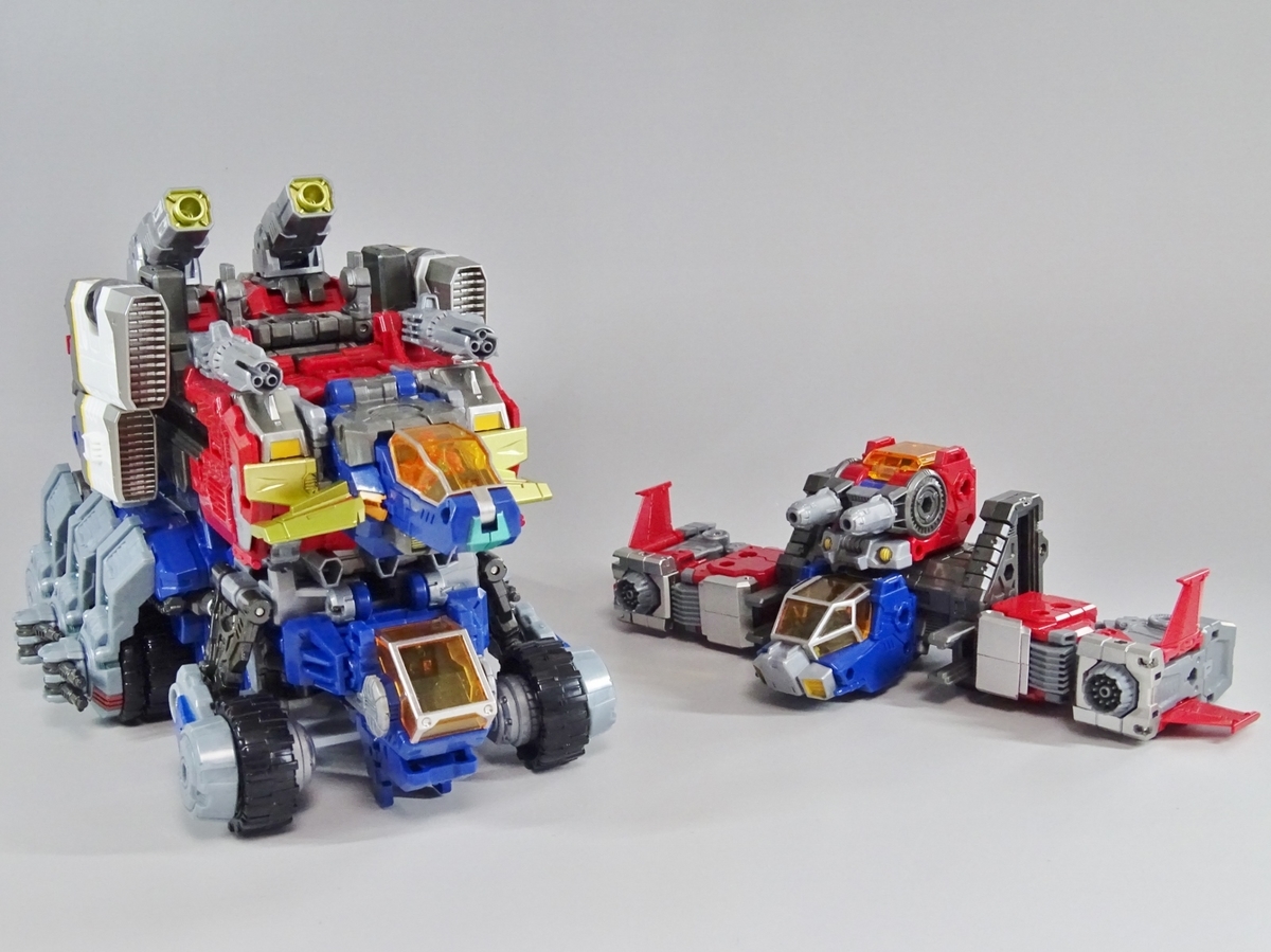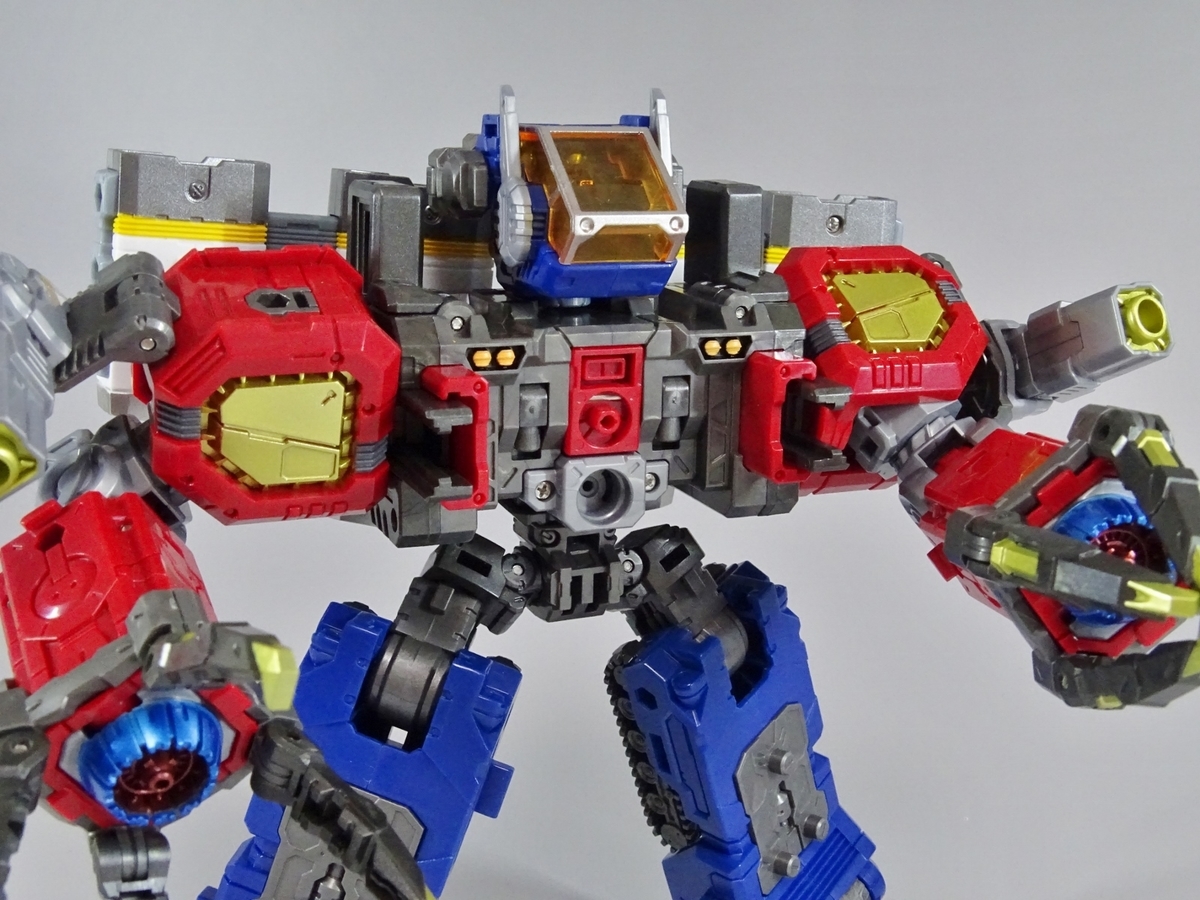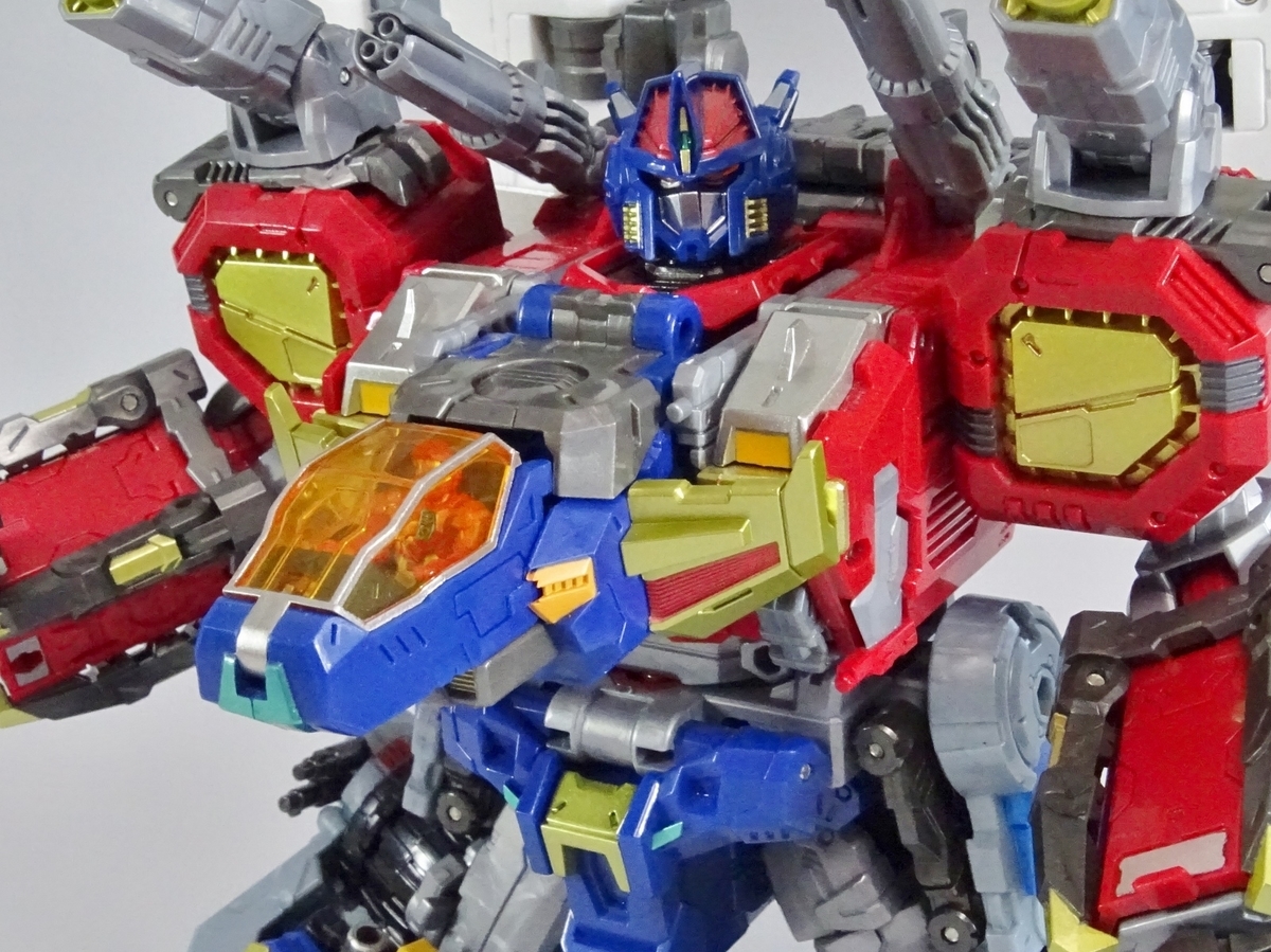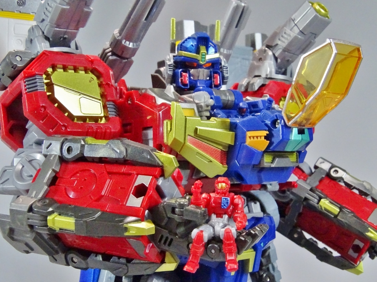 バトルコンボイとパワードグレイターの合体形態である新生パワードコンボイ。旧パワードコンボイはトランスフォーマーのウルトラマグナスの流用元として有名ですが、バトルコンボイが旧型の面影を色濃く残していたのに対し、パワードコンボイは全く異なる雰囲気のロボへと変貌しました。グレイターの名の通り、さながらグレート合体した勇者ロボのようです