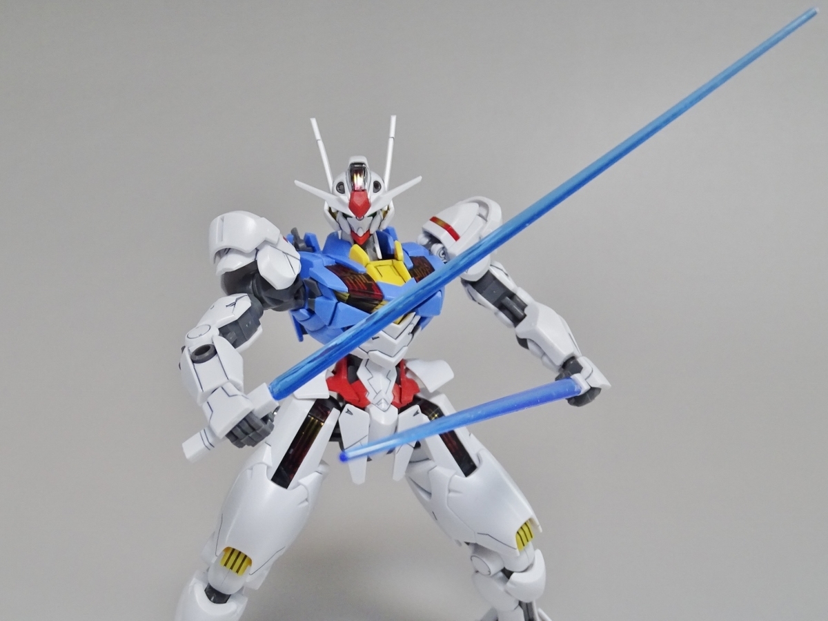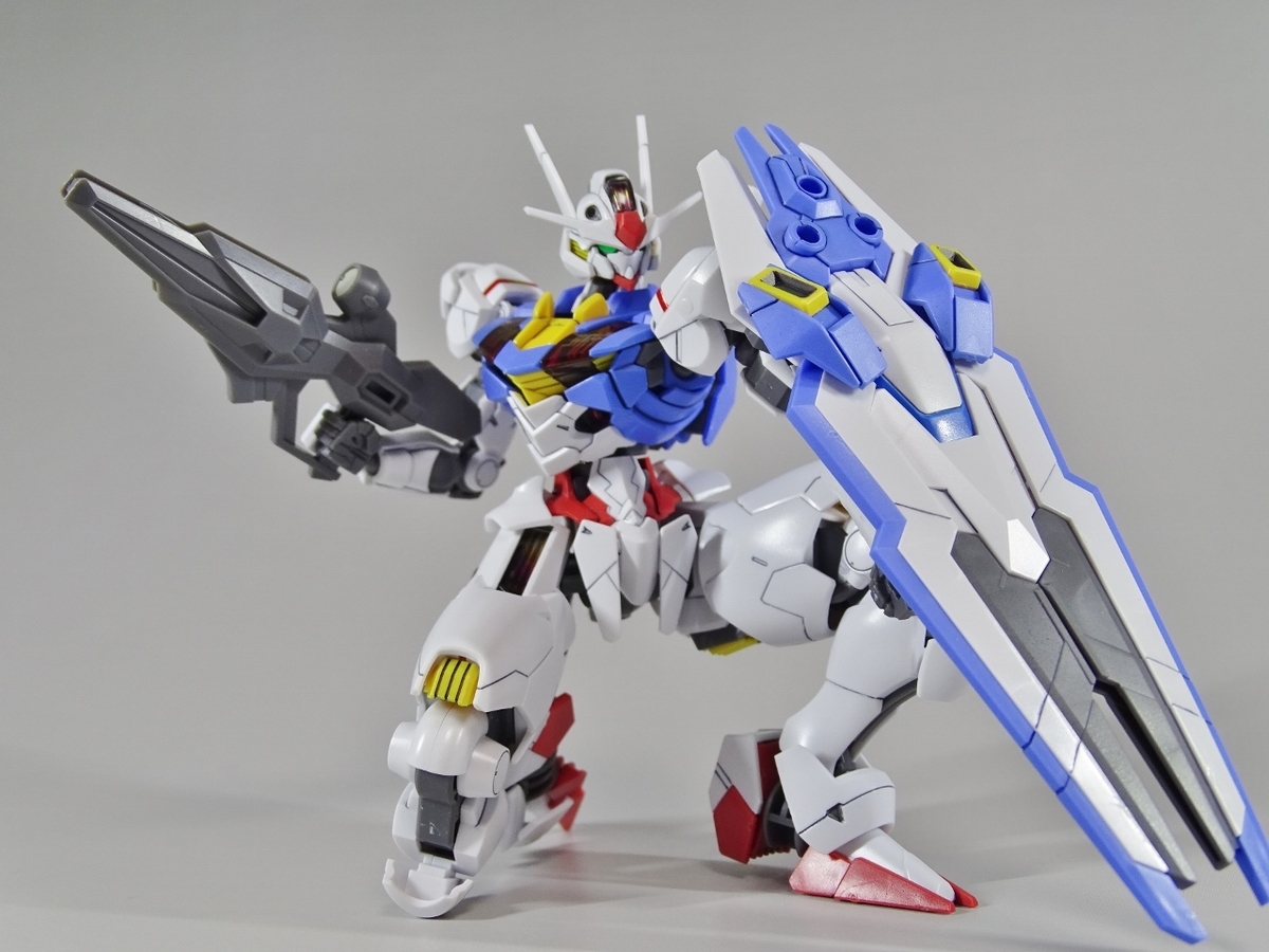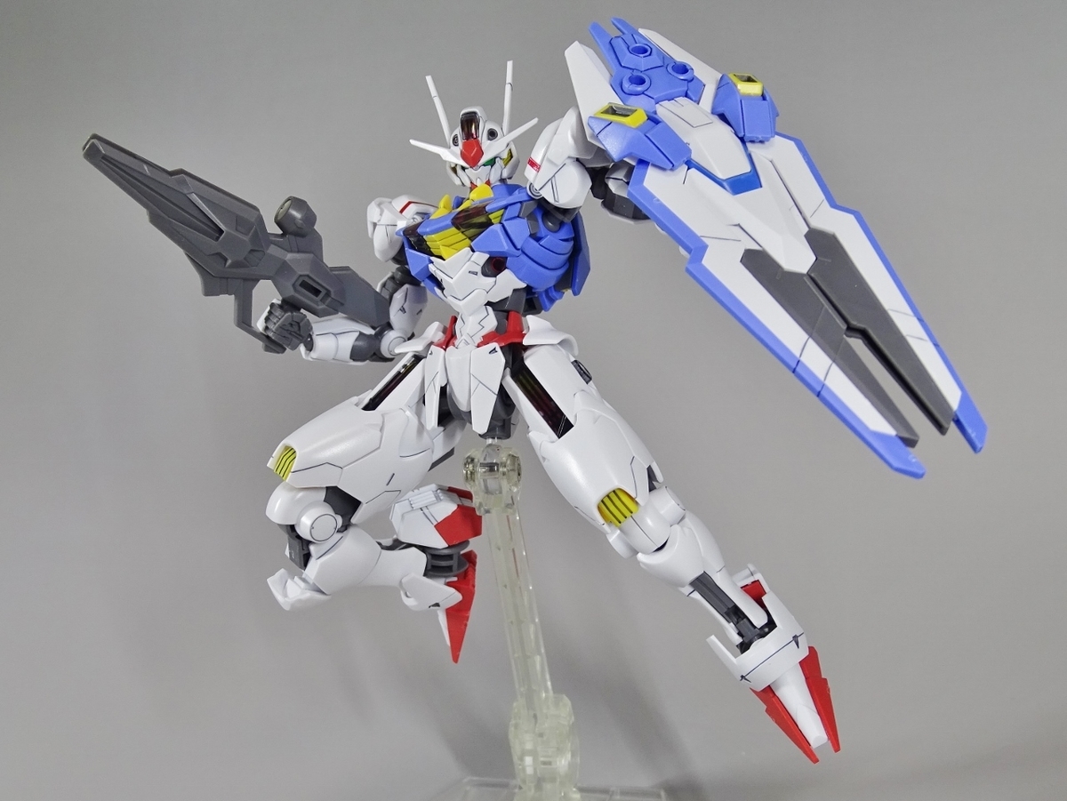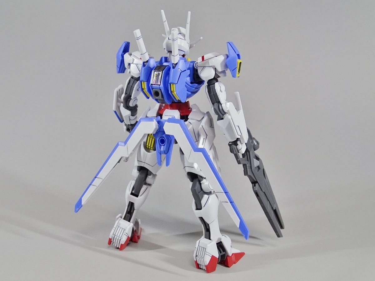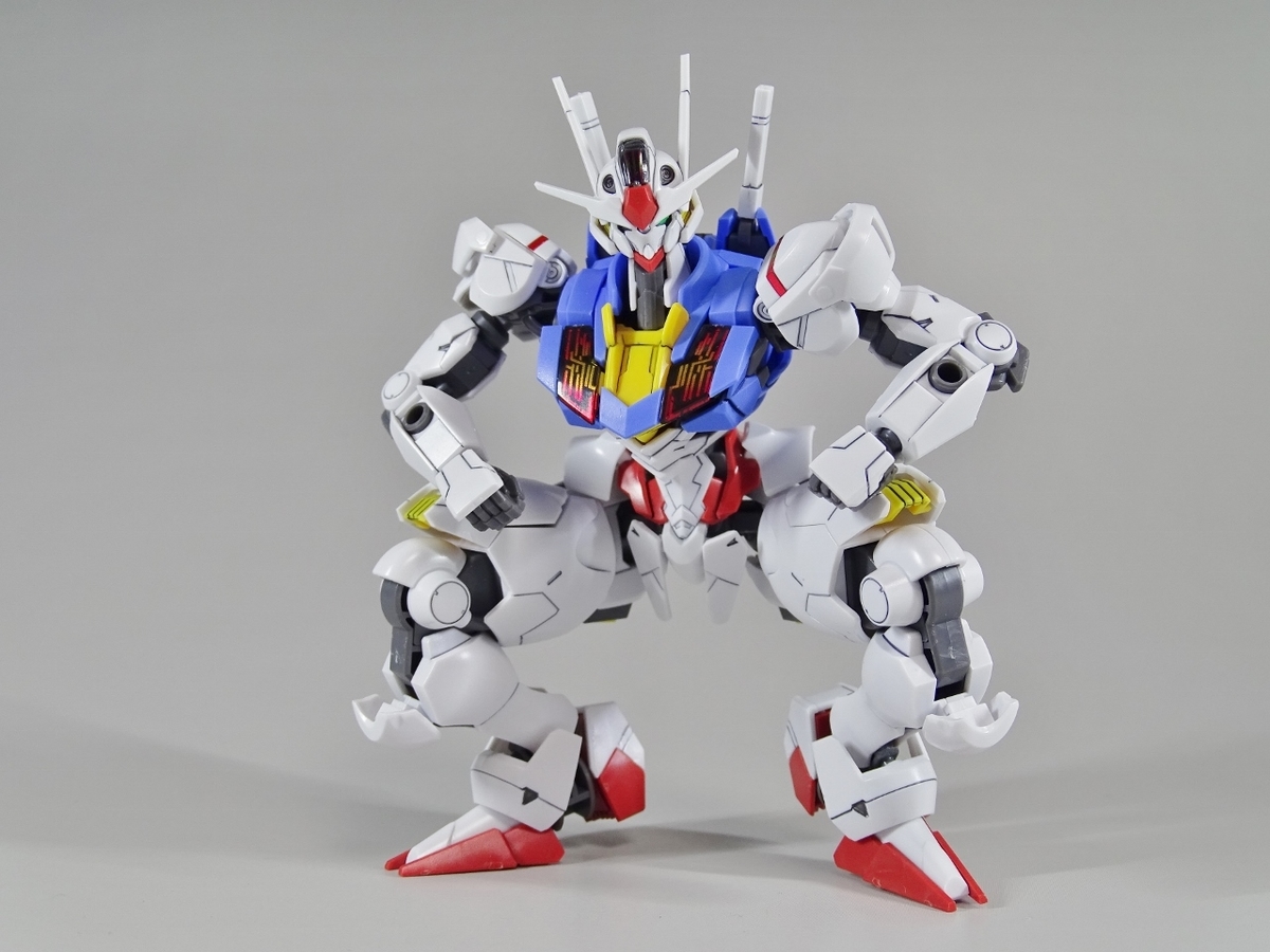 ガンプラ転売ブームが沈静化しないまま放送開始を迎えてしまった『水星の魔女』より主人公機のエアリアル。独特のデザインの機体のはずなのですが、プラモはなんだか前作のバルバトスを丸っこくしたような雰囲気になっています
