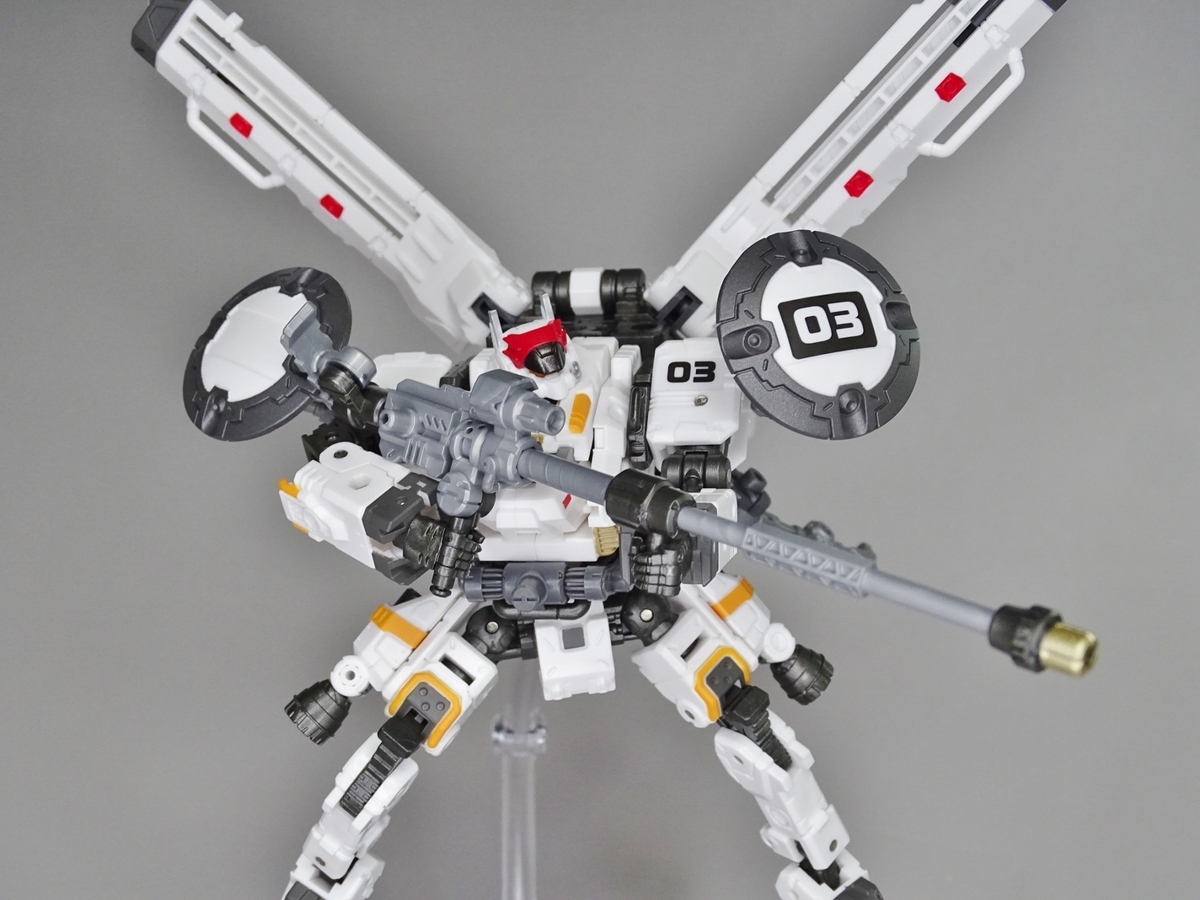 オービソプターユニットを展開。中央に大小のミサイルを計3基、左右にスライド式ブースターユニットを備えています。某海賊ガンダムみたいですね