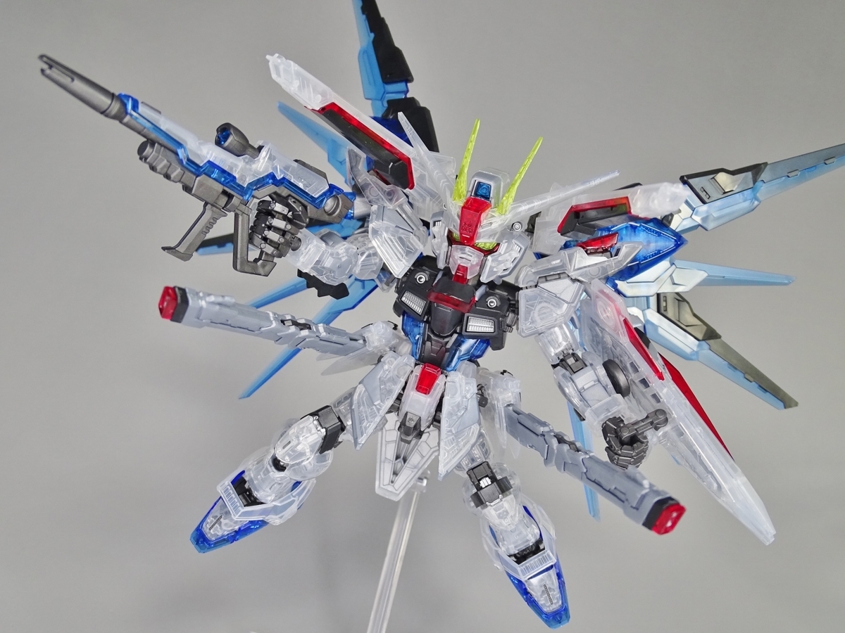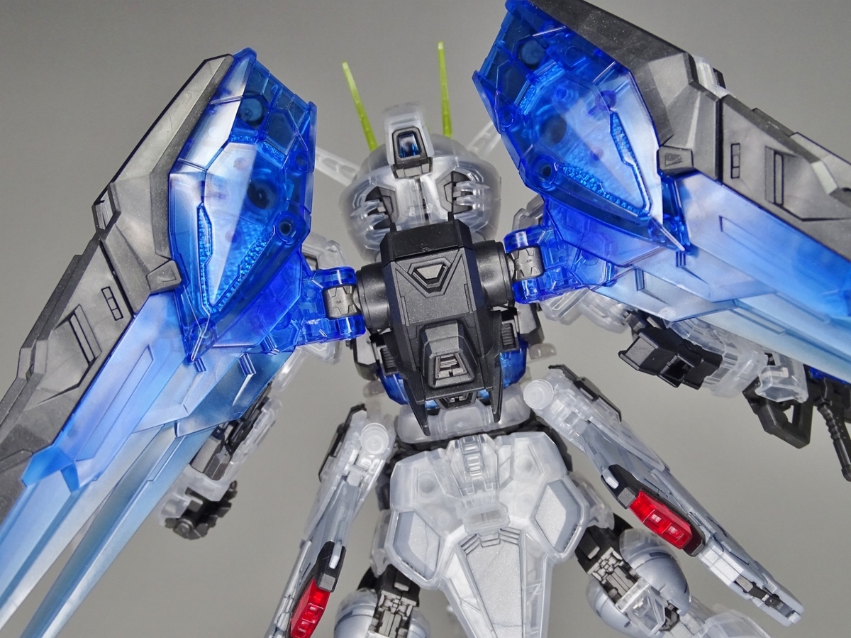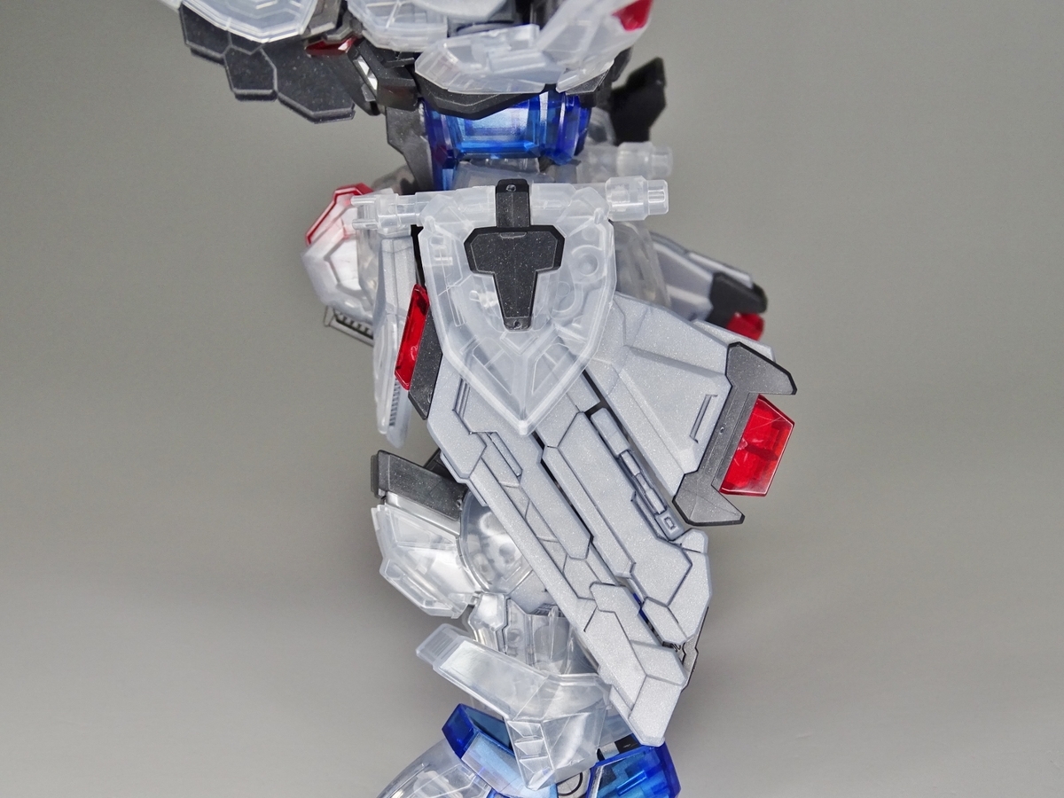 ウイング内部の水色のクリアパーツにはリフレクションカットという反射効率を高めた造形が施されているのですが、全身クリア成形のため埋もれ気味。バックパック下側のスラスターを開くとスタンド用の3mm穴が露出します