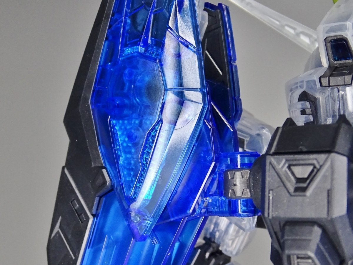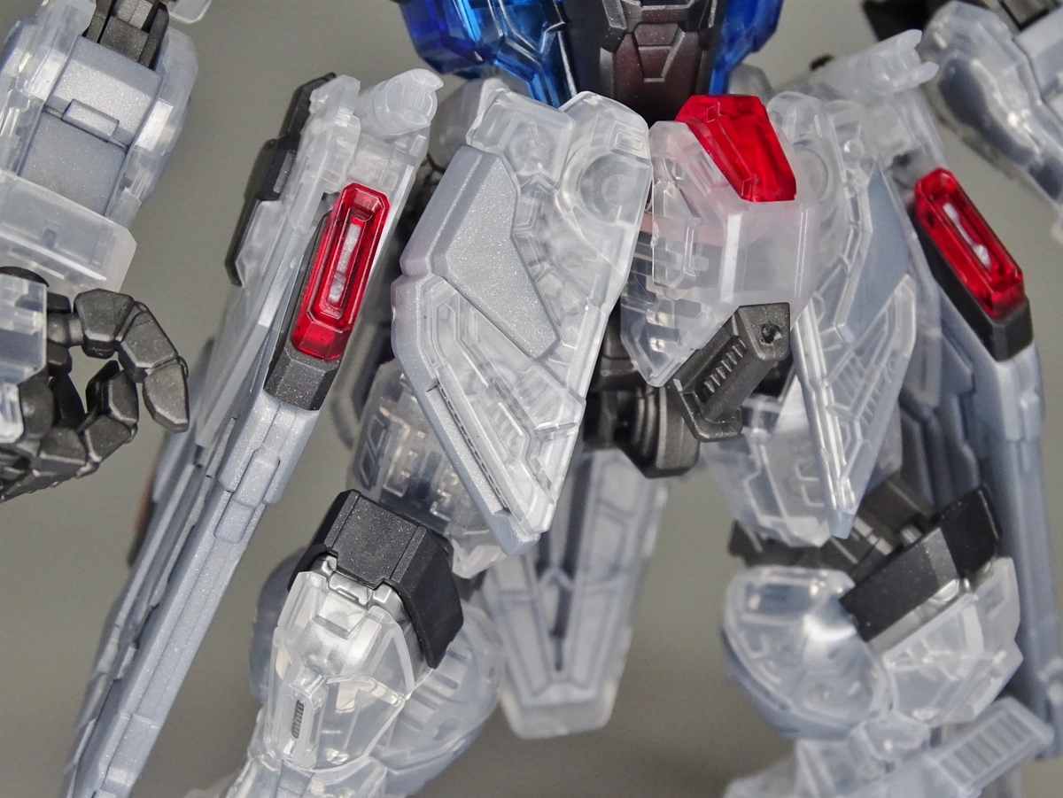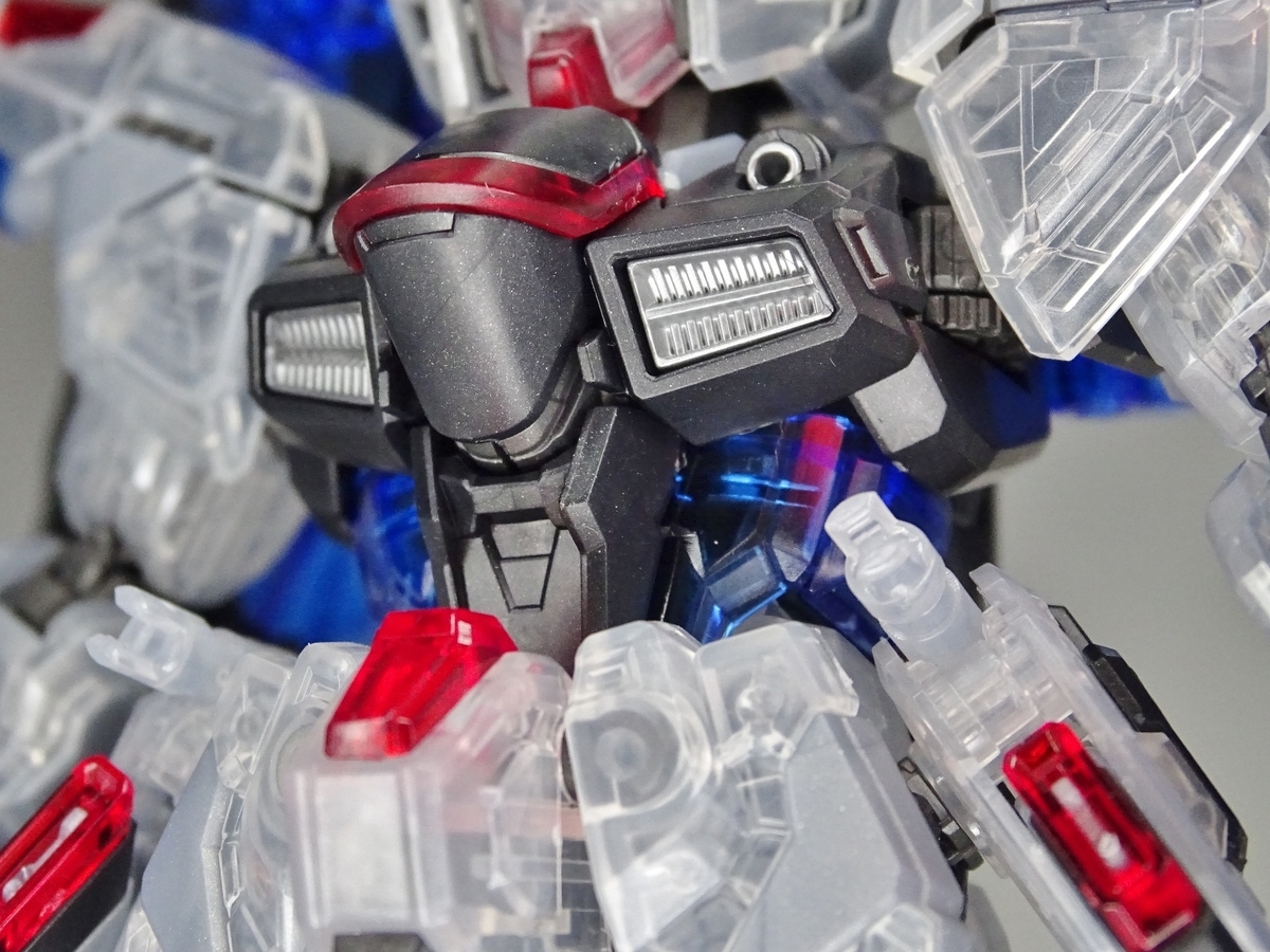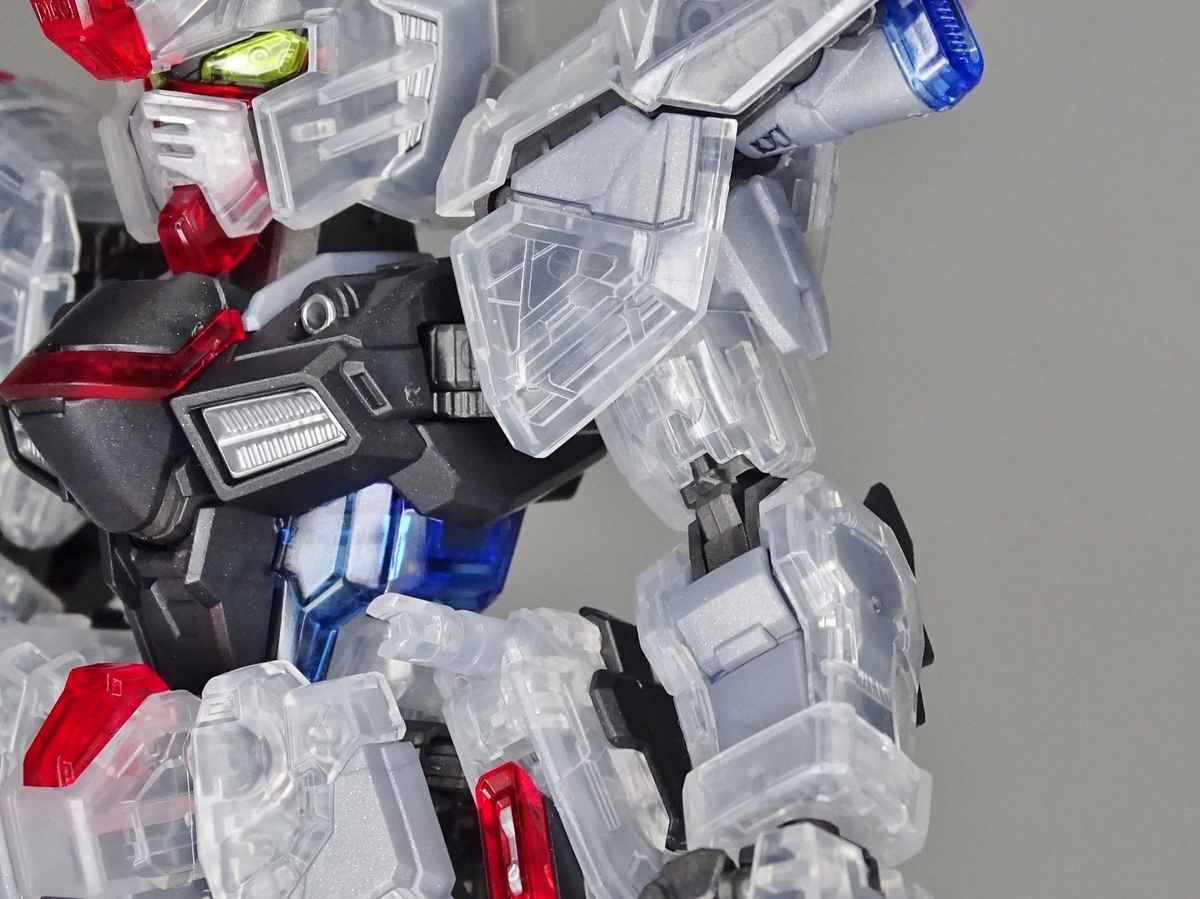 各部アップ。メタリック成形のフレームとクリア成形の装甲パーツは相性抜群。マスターグレードらしく装甲裏面にもモールドが彫られているのですが、クリア成形だと全て透けて見えるため密度感も大幅にアップしています