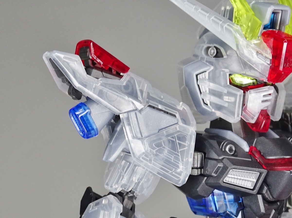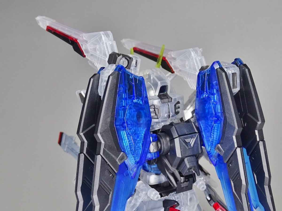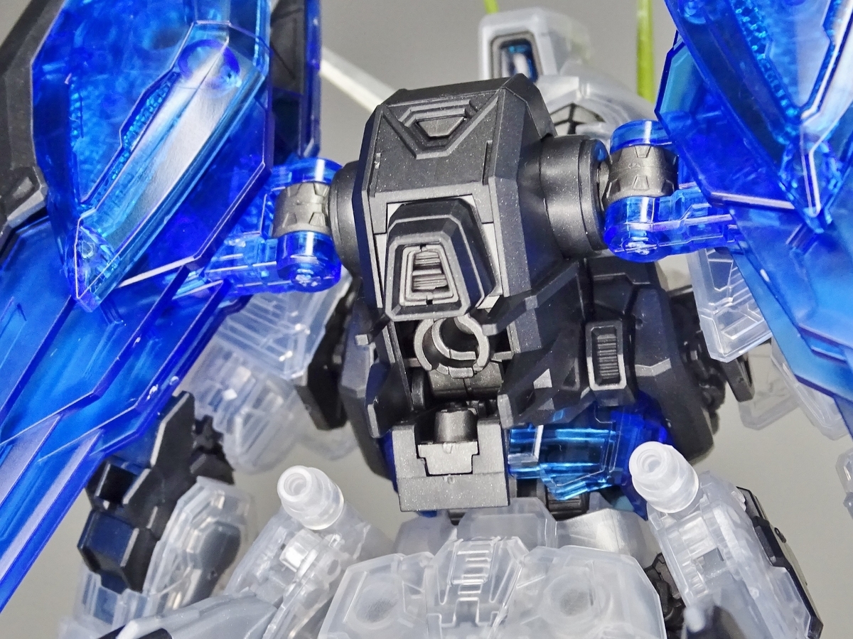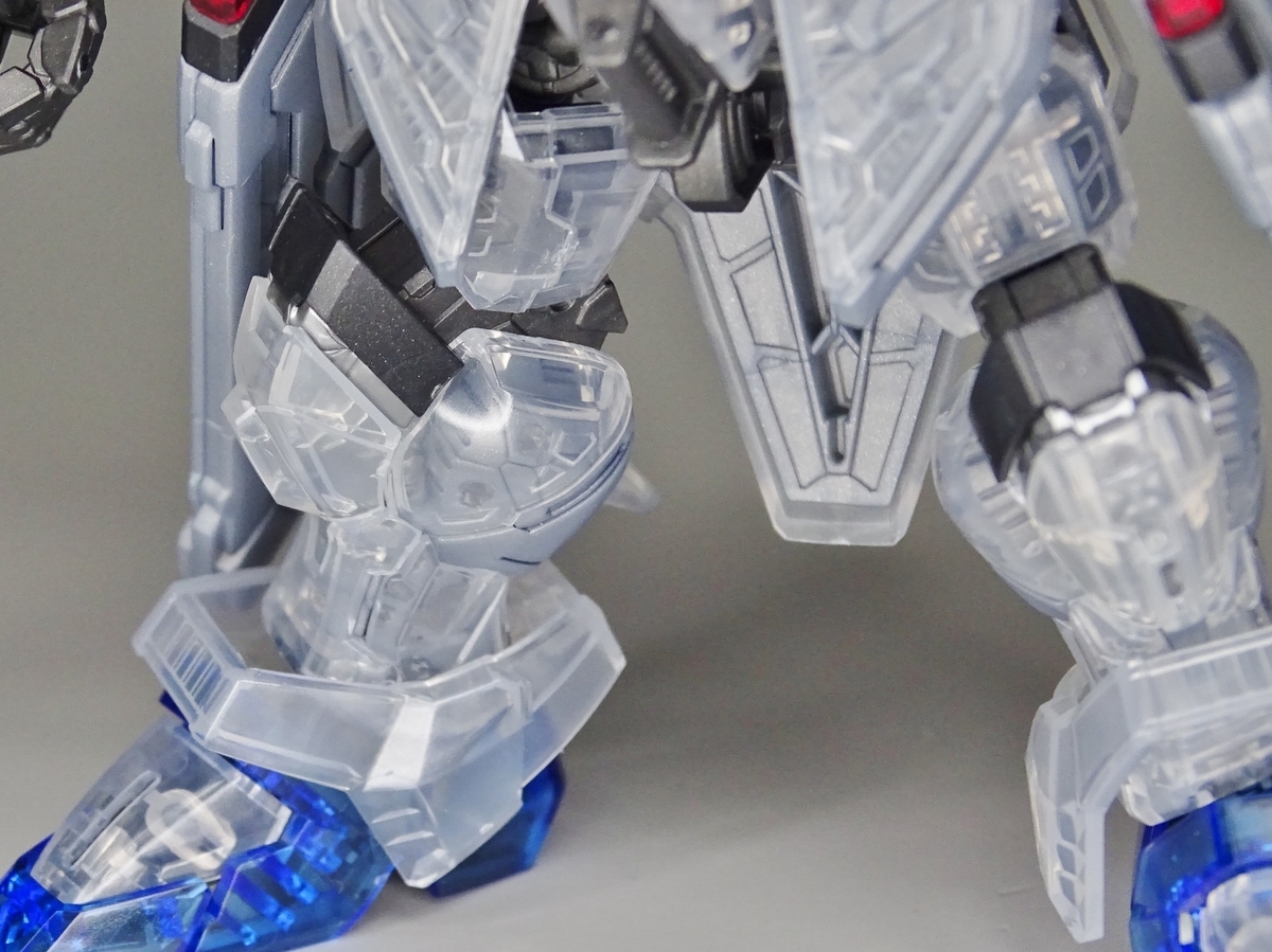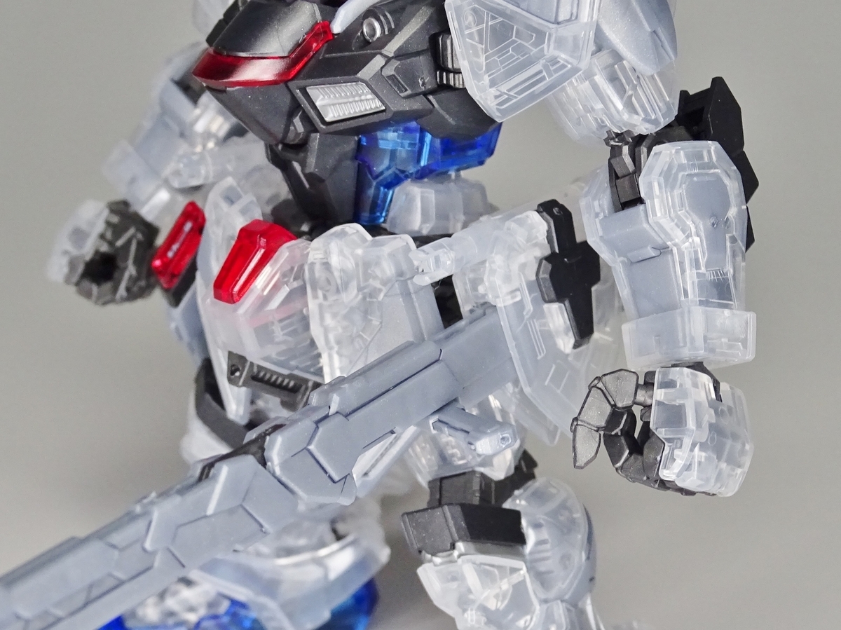 各部アップ。メタリック成形のフレームとクリア成形の装甲パーツは相性抜群。マスターグレードらしく装甲裏面にもモールドが彫られているのですが、クリア成形だと全て透けて見えるため密度感も大幅にアップしています