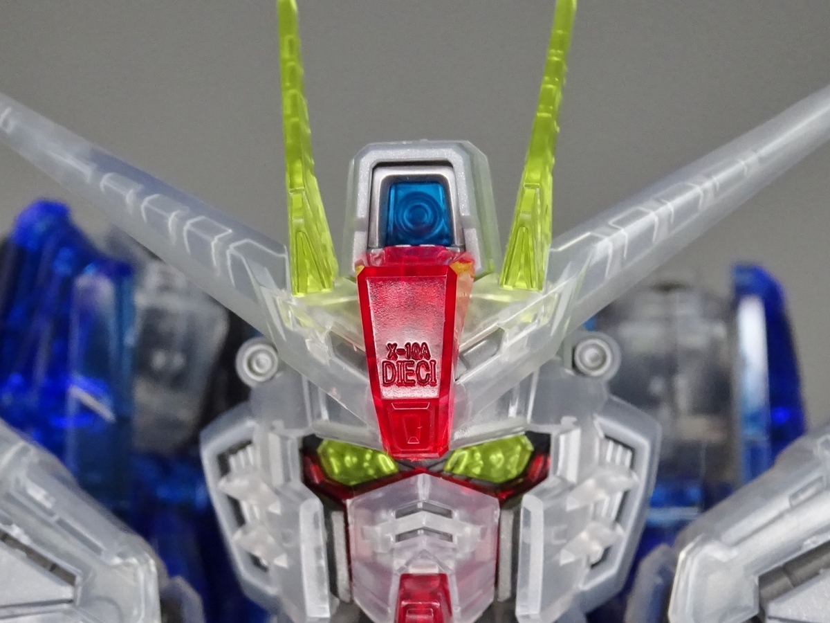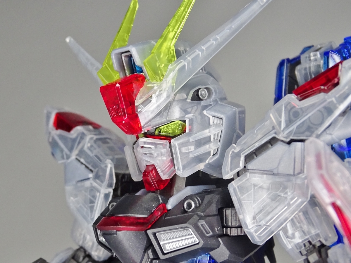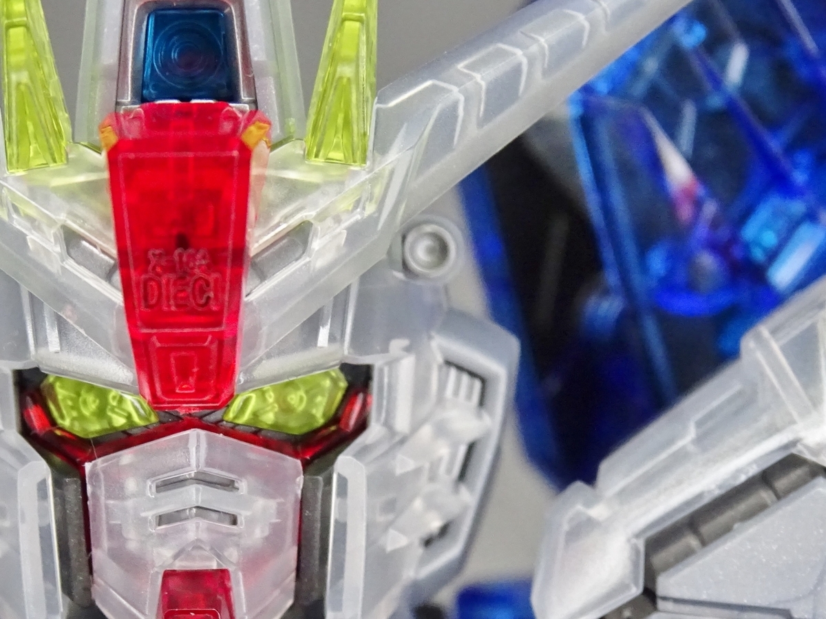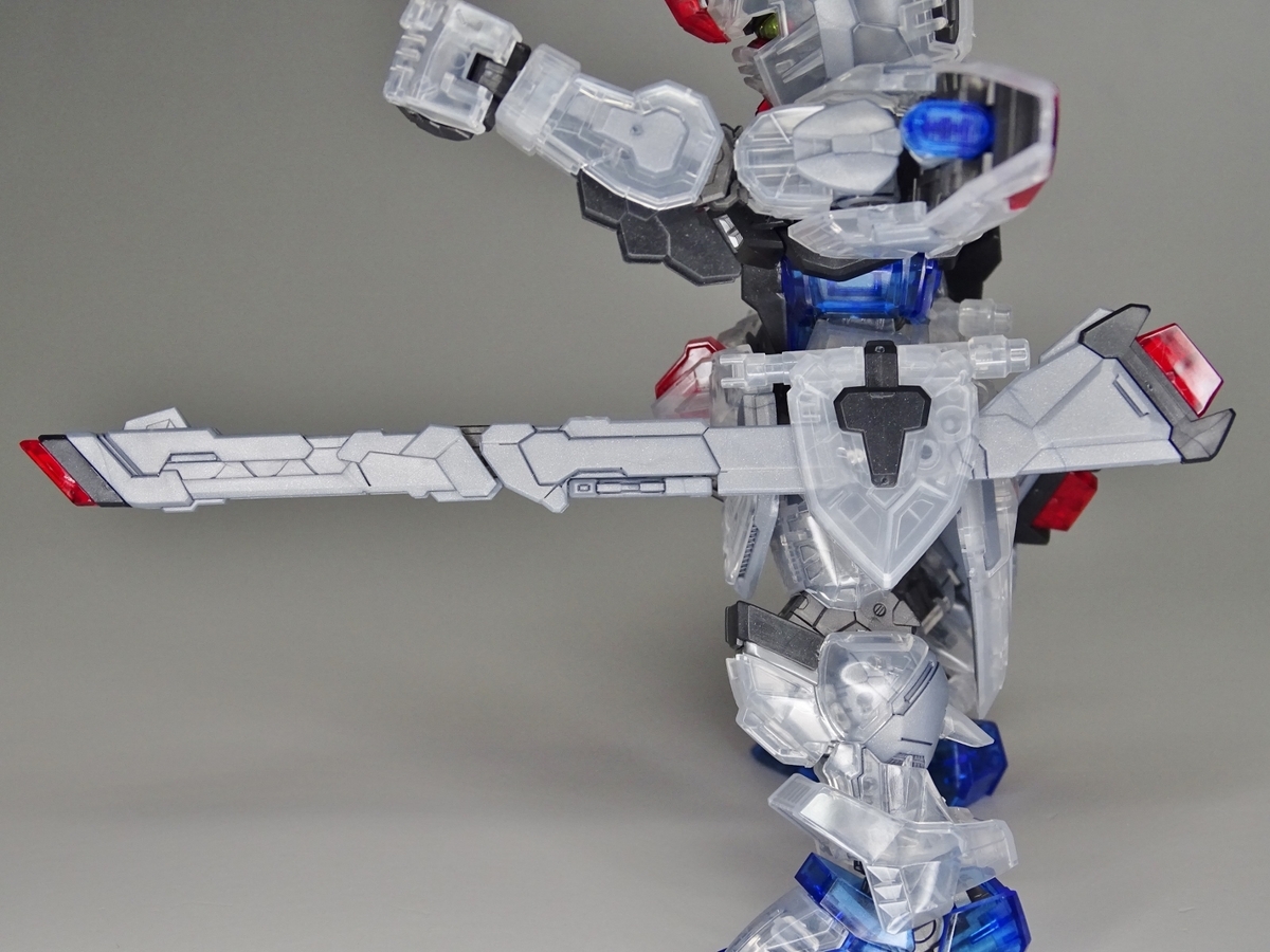各部アップ。メタリック成形のフレームとクリア成形の装甲パーツは相性抜群。マスターグレードらしく装甲裏面にもモールドが彫られているのですが、クリア成形だと全て透けて見えるため密度感も大幅にアップしています