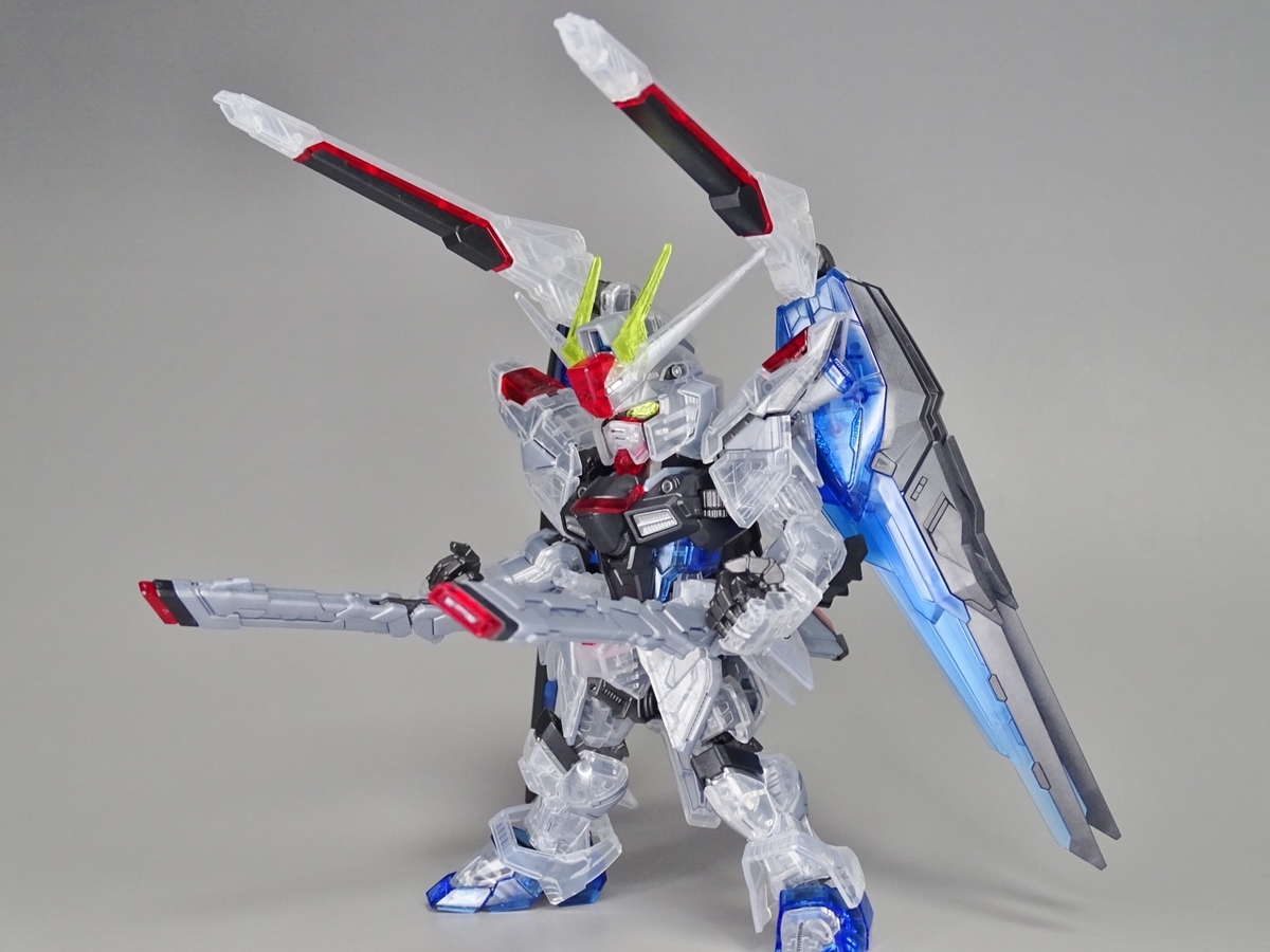 二重関節や引き出し式関節の数々で、SD体型であるにも関わらずフリーダムの特徴的なアクションも問題なく再現可能。脚も短いながらそれなりに表情付けへ貢献しています